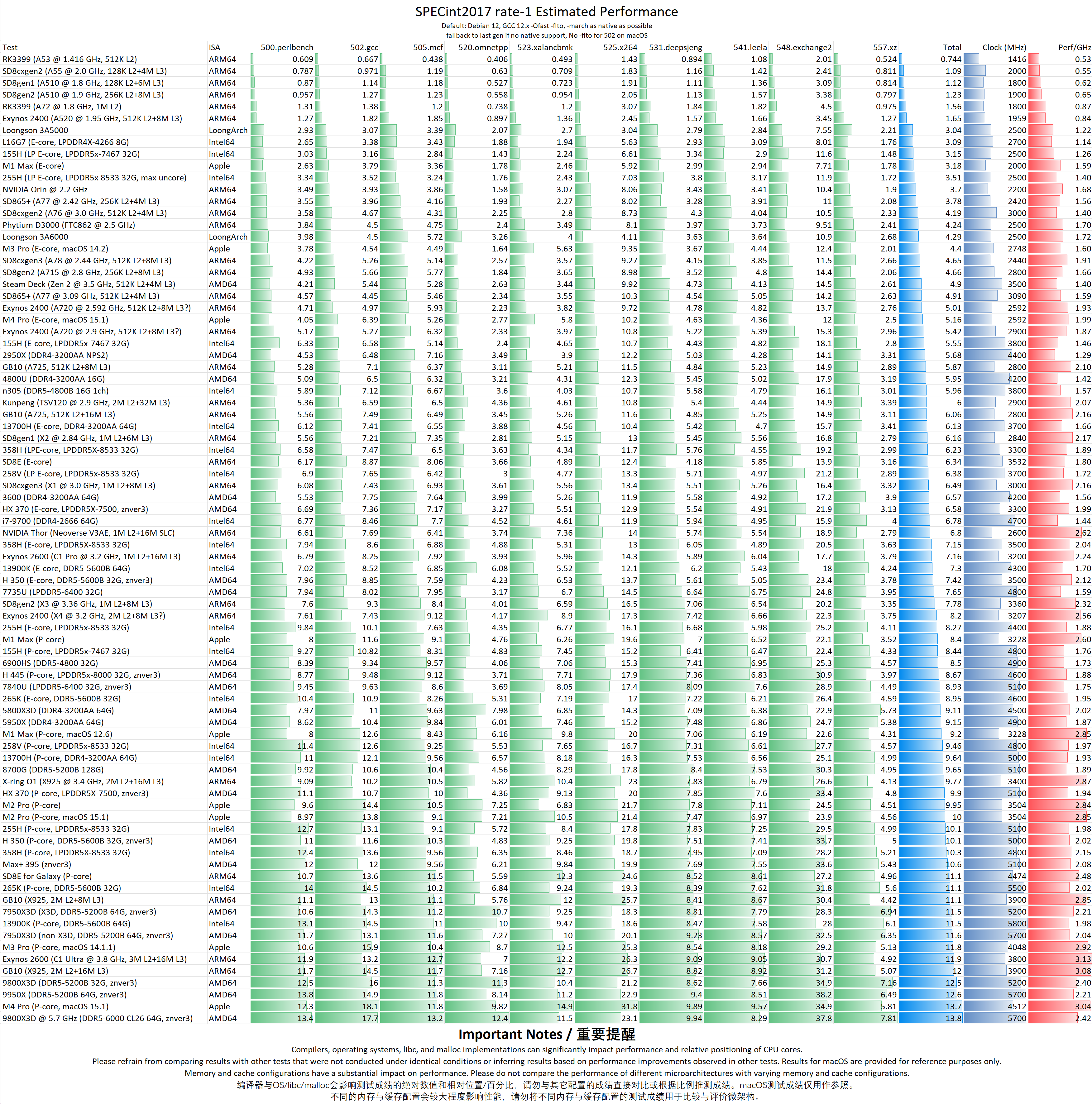 • (8/5/2024) 修正鲲鹏TSV120的成绩。由于此前测试的内核版本过旧,与近期收集测试成绩的环境有较大差距,且编译器-march参数未专门针对调优,因此可能造成了一些额外的误差。感谢 @Matterhorn 提交较新内核的测试结果,完整报告参考此处