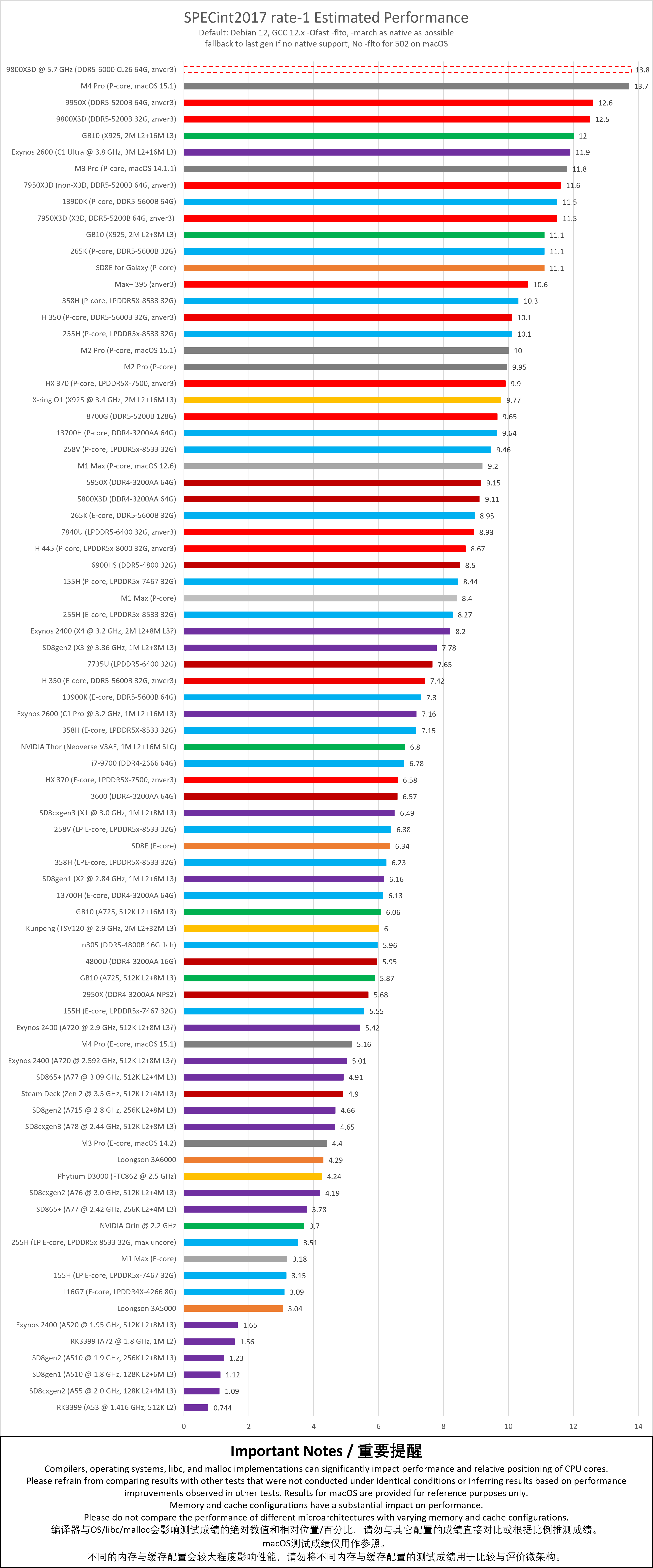 • (9/17/2024) 加入9950X的测试成绩;加入M1 Max Linux测试成绩;使用更严格的测试标准刷新以下处理器的成绩以获得更好的准确性:6900HS, 7735U, 7840U, 7950X3D, 13700H, Exynos 2400, HX 370, i7-9700, i3-N305, Snapdragon 8 gen 2;在图片中加入一些文本提示。